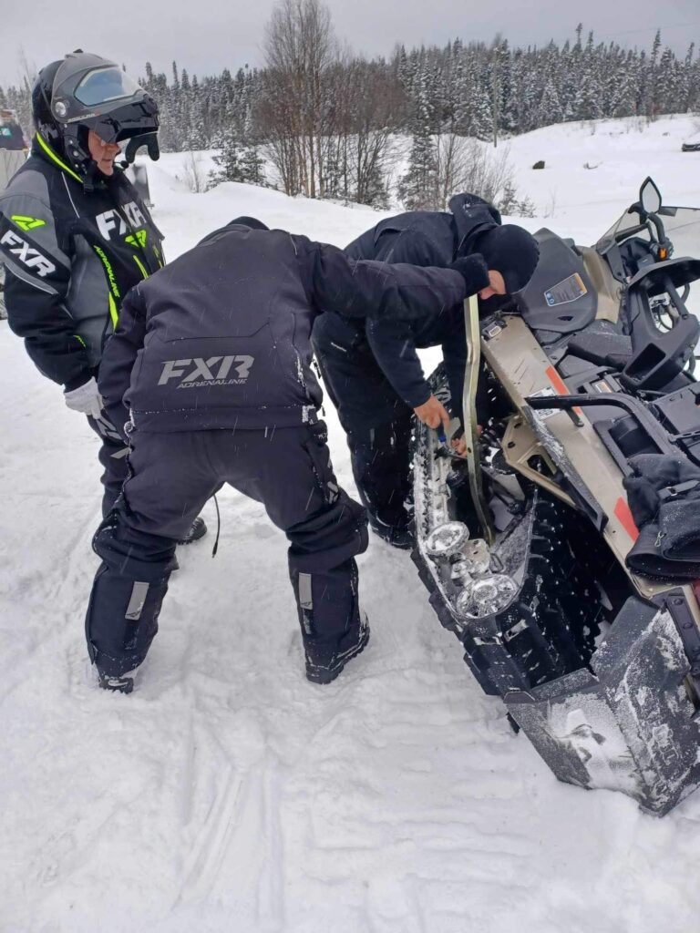 Bien sûr, rien n’est jamais parfait! En début de parcours, la machine qui devait être vérifiée (sur la coche) n’a pas été correctement inspectée. L’un des morceaux du dessous de la motoneige a été installé à l’envers. Par chance, un de nos coéquipiers était doué dans le domaine et a arrangé le tout rapidement.